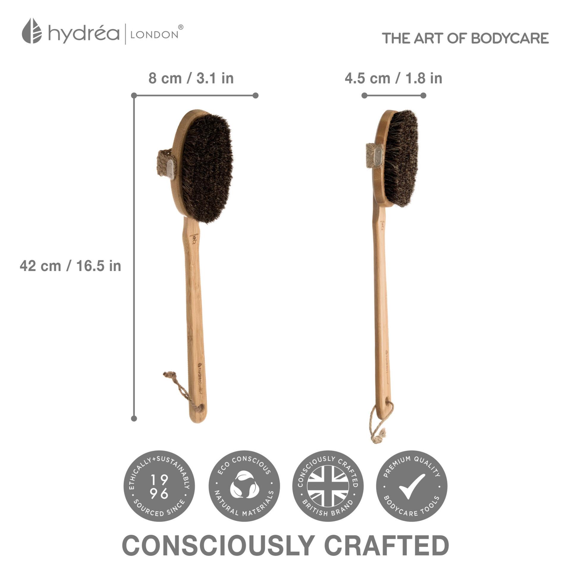 Our Body Brush is carefully crafted from 100% natural materials and designed with cactus and mane bristle to create the perfect textural balance for effective body brushing without being too coarse. The long, detachable handle makes it easy to get to those hard to reach areas and is detachable for when more controlled brushing is required.