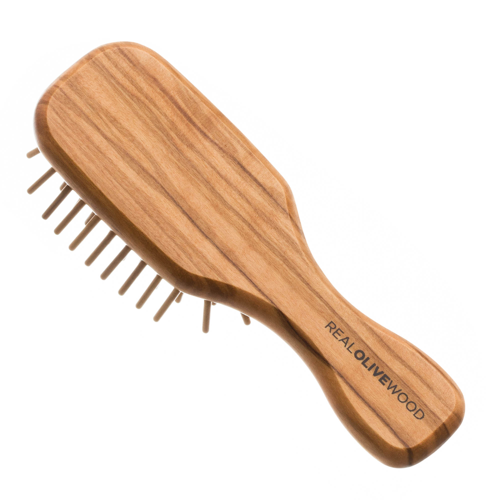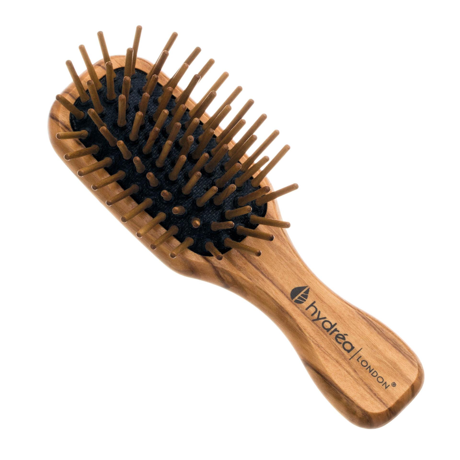 A miniature, handbag sized brush. Crafted from sustainably sourced, Mediterranean Olive Wood which boasts a unique, distinctive grain and a rich depth of colour. The pneumatic rubber cushion prevents hair pulling for pain free brushing whilst the rounded wooden pins stimulate scalp circulation and prevent static build-up leaving hair feeling smooth, sleek and manageable.