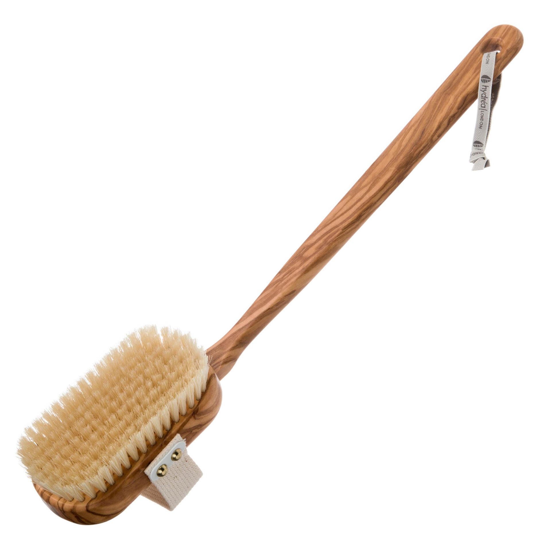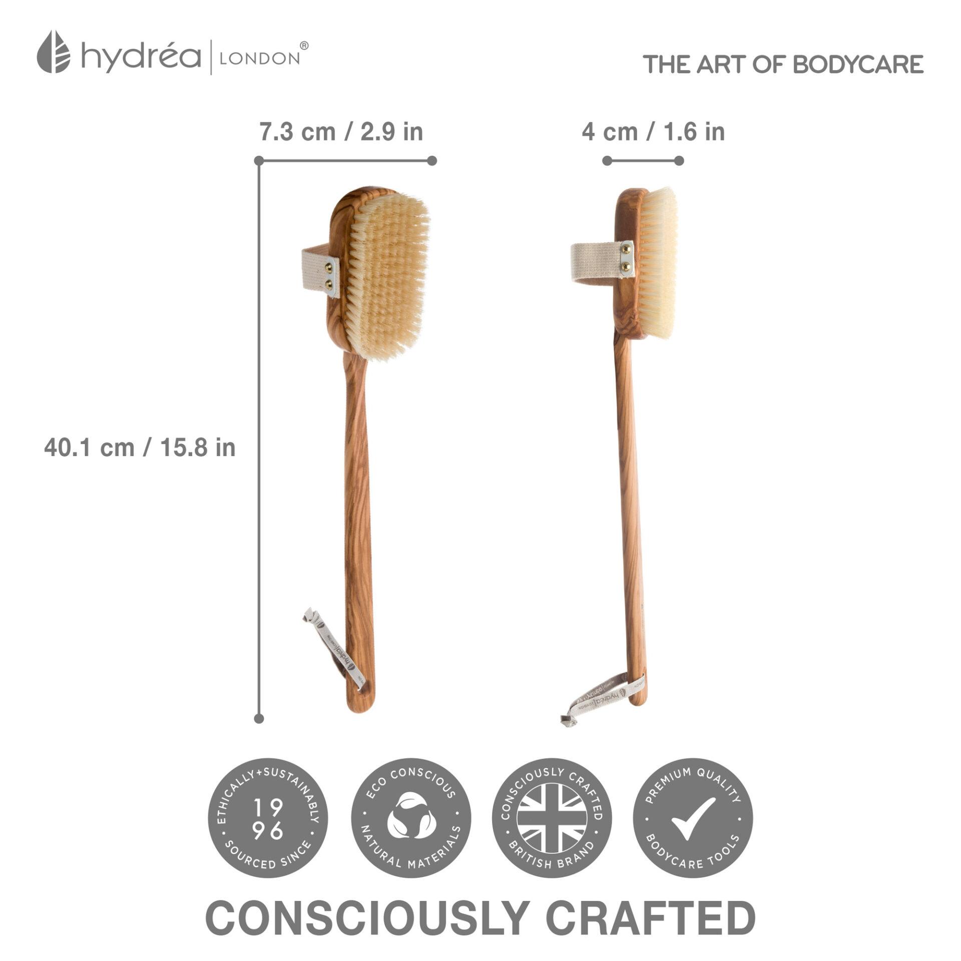 Our Premium Body Brush is carefully crafted with sustainably sourced Olive Wood which boasts a beautiful distinctive grain. The natural oils within the Olive Wood help to strengthen the wood and provides extra protection against water damage. The long handle makes it easy to get to those hard to reach areas and is detachable for when more controlled brushing is required.